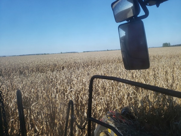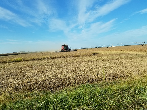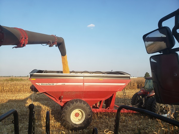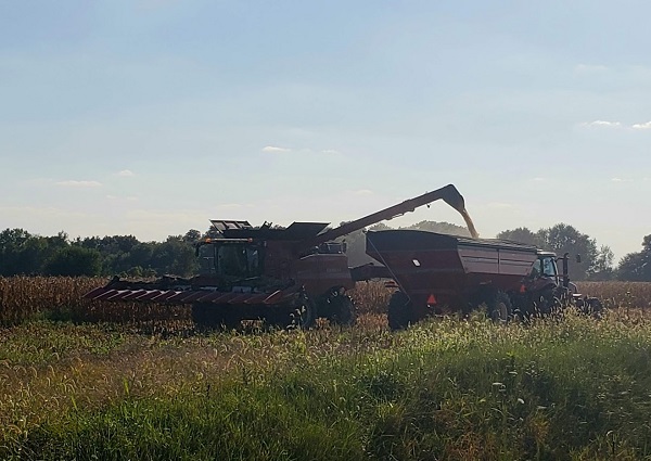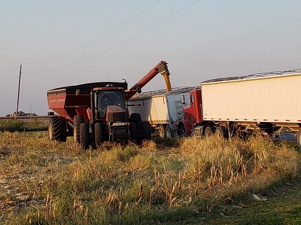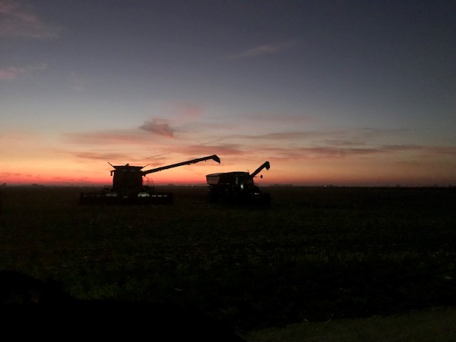 Dumping the popcorn from the combine to the auger cart, which will then take it to the semi.